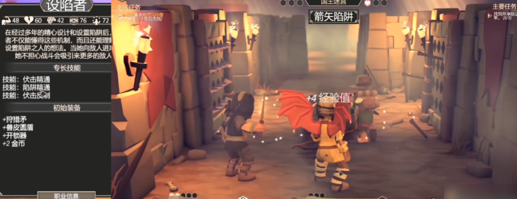 接下来就是设陷者,这个职业作为一个辅助职业,强度不会特别的高,但是本身的机动性还是很不错的,所以敏捷度还是很不错的,可以很好的避开敌人的攻击,在使用这个职业的时候可以增加一定的防御效果,那么主要是机动性也很不错,在前面地图当中也有许多的陷阱,需要大家来避开,可以利用这个职业来直接进行拆解,同时它的主要输出方式还可以进行反击,分击的伤害也可以算在输出当中,还有一个卖艺人。