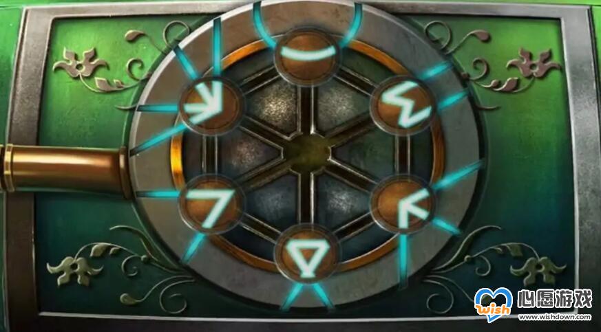 8、走进这颗巨大金属球体,来到开关处,在这里可以得到古书装饰物,并且根据提示,将圆盘上箭头按照要求放置,即可打开金属球。