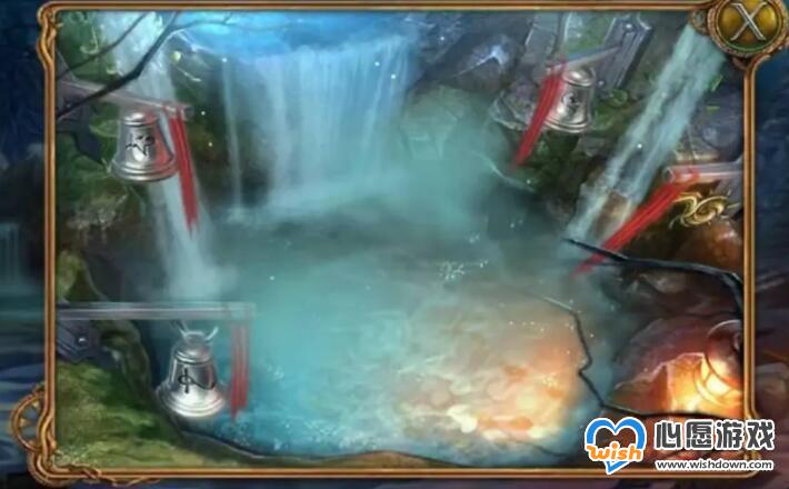 7、得到领导以后,来到温泉这边,给第四个横杆挂上银铃,再按照它演示的顺序点亮每个铃铛,完成以后池底的水消失,得到地窖雕像头部。