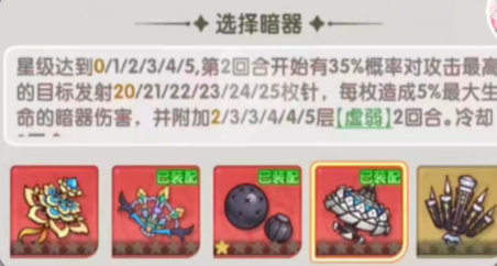 子母追魂也是很不错的一个暗器,它的爆杀能力很强,能够快速的锁定目标,从而实施最强的攻击。它不仅有着良好的追踪功能,还能在一定程度上给敌人造成麻醉作用。这种麻醉效果能够持续多个回合,能够为阵容带来一定的帮助。如果你是新手想要在战斗中实现突破,子母追魂是一个不错的选择。想要进一步放大武器效果,提升星等级是不错的策略之一。