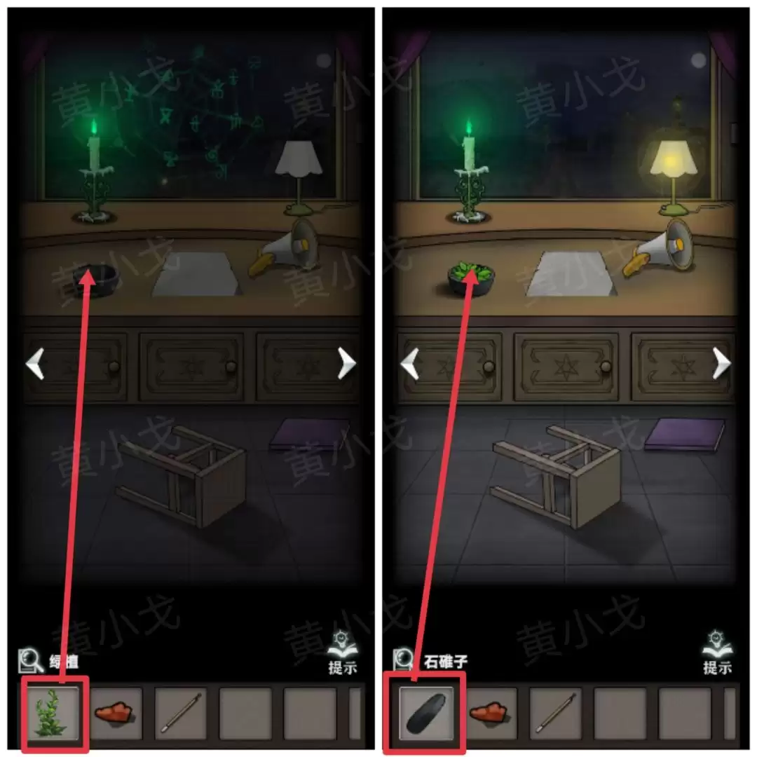 最后一步合成。在窗户边的石椿里放入【绿植】,用【石碓子】将其碾碎。