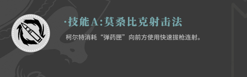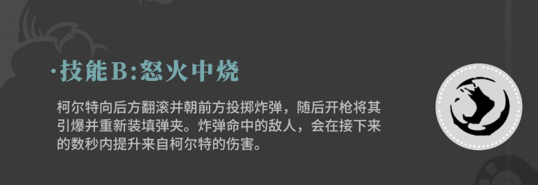 在第一个技能上面,柯尔特可以带来莫桑比克射击法,这个技能的效果一样也是跟前面的弹药匣相关联,此时需要提前将弹药匣里面的火力都充能起来,积累足够的数值之后,柯尔特使用这个技能一就可以消耗其中弹药匣的数值,来向前方使用一个连射的攻击,此时的连射速度也是非常快的,第二个技能叫做怒火中烧,这个技能则是要有一个前摇动作,使用怒火中烧的时候,柯尔特会先向后方翻滚一下,此时对前方造成的射击是投掷的动作。