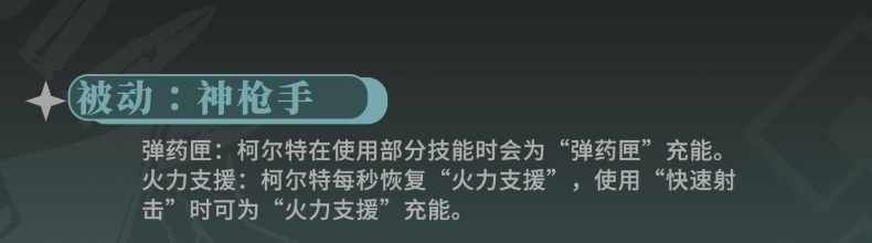 而在被动技能上面就是神枪手的效果,神枪手是柯尔特可以被动触发的能力,因为在使用这个被动的时候数值跟弹药匣相关,所以在弹药匣的实战数值变化的时候,大家一定要多加关注了,柯尔特在使用其他角色技能的时候都会给自己的弹药匣进行充能,所以后期在触发被动之后就会带来火力支援的效果,此时柯尔特每秒都会恢复自己的一些火力支援数据,使用快速射击的时候,还可以给自己的火力支援带来充能的效果,所以被动大家可以看作是柯尔特的一个恢复能力效果。