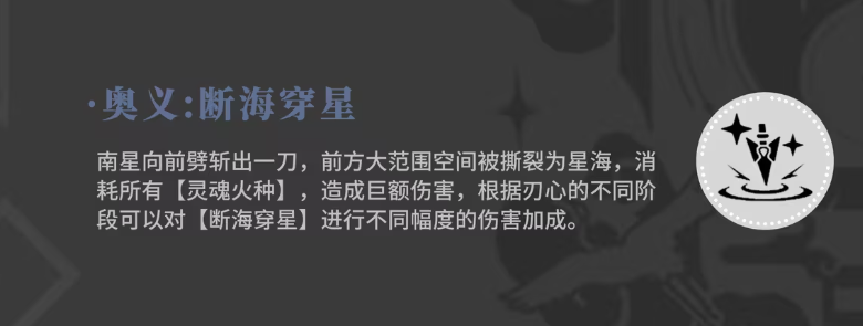 大家也可以使用技能针对敌人的破绽处进行攻击,利用光刃的效果提升自己这个技能上面的输出伤害,南星本身的大招是向前劈,斩出的一刀带来的范围攻击是非常大的,而且是可以对前方造成一个撕裂空间空间的,这个撕裂的空间被叫做星海,同时消耗掉自己所有的灵魂火种,对这个星海周围所有的敌人,带来大范围的高数值伤害,还可以根据刃心的不同阶段来提升此时的能力,在数值上面可以对断海穿星进行强化,强化主要带来的就是伤害类型的提升。