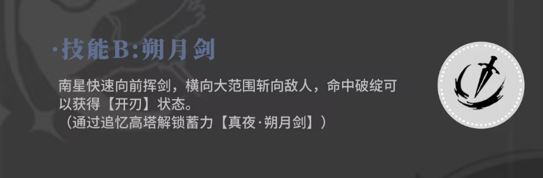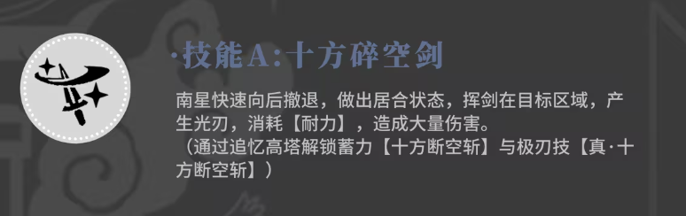 技能一在使用的时候,南星会快速的往后撤退,带来一个聚合的状态,其实这也是专属于她的状态,别人是没有这类效果的,处于聚合状态内的时候,南星有一定的增幅效果,此时只要是她挥剑在一定的区域范围之内,对目标都可以带来光刃输出,当然这个光刃输出是需要消耗很多的耐力数值,带来的伤害也是大量伤害的,此时这个技能叫做十方碎空剑,后期的话大家可以通过追忆高塔的挑战,来解锁这个技能的蓄力效果,也就是十方断空斩的能力,解锁十方断空斩之后能够带来的输出是更大一些的。