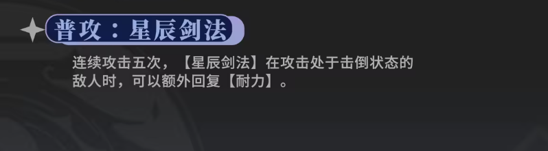 南星的技能上面其实是带有刀剑类效果的,普攻上面也是可以连续攻击5次,普攻的名字也非常好听,叫做星辰剑法,大家使用星辰剑法的时候,只要攻击是处于倒地状态的敌人,那么这里恢复的耐力数值会比较高,在使用魂技星辰变的时候,带来的就是一个强化类型的效果,因为这个强化是根据南星的基础攻击,后面第二段以及第三段的效果进行强化提升的能力,所以造成一定伤害之后,还是可以在怪物倒地状态下进行一定的弱点攻击,带来足够的耐力回升效果。