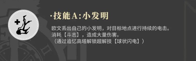 在技能一上面,欧文有一个小发明的技能,使用这个小发明技能的时候,他可以找到一个目标地点,在这个目点地点范围之内可以带来一定的电击,而且电击的效果是持续性的,不过有斗志效果加成的话,这个电击会造成更大量的伤害,后期如果大家把这个技能解锁为超解技的话,还可以变成球状闪电的能力,球状闪电带来的整体电系输出影响会更大一些,他的技能二叫做论证壁垒,这个技能会给大家带来更多的耐力数值效果,战斗里面使用论证壁垒,会消耗自己前面积累的耐力数值来抵御对方带来的伤害。