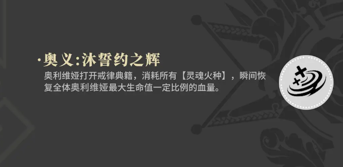 在输出效果上面也是需要靠子弹的精准来对敌人进行输出,最后奥利维娅是有个大招,她的大招是需要根据这个戒律典籍来进行输出的,使用大招的时候,她会打开手中的这本戒律典籍,然后消耗她之前积累的所有灵魂火种,灵魂火种在游戏中就相当于这个角色的能量积累数值,在消耗之后带来的能力是恢复全体角色的血量,并且在恢复数值上是根据奥利维娅的生命值来进行比例提升的,所以如果大家想要用好奥利维娅的话,把她放在辅助位上是比较不错的,她的很多技能基本都是给自己带来能量加成的,还有给队友带来回血效果,而且特别是大招,可以给全体的队友都带来一定血量的恢复。