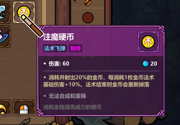 驻魔硬币(基础伤害60,攻击的时候弹幕变陈弹幕,每次点击都会失去20%的金币,每个金币都能增加基础伤害+10%)普攻流的终极目标,获取的话要大家在第二关使用有爆炸功能的法杖炸雕像,小概率会出。金币需要触发金币翻倍与生命换金币的药水,属于药水流的符合玩法。贪婪戒指搭配之后能实现无限弹药续航。成型之后是全游戏最爽build之一。