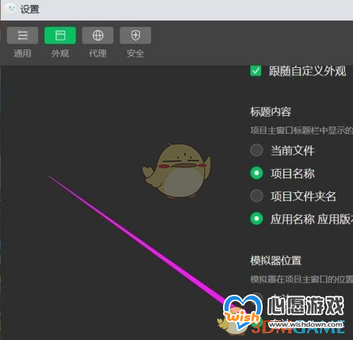 3、在“外观”窗口中,“模拟器位置”的值改选为【右边】完成。