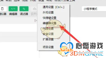 2、然后在弹出的下拉框中选择编辑器设置功能。