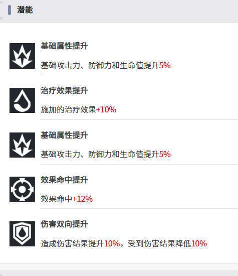 如果大家是把放米娅在奶妈位置上用的话,有这个潜能,她整体带来的治疗也就是大招效果会更强一些,那么在第3个潜能基础属性提升上面,也是在攻击力防御以及生命值值上面再一次提升5%,这个潜能跟第2个潜能是不会相克的,也就是这个潜能跟前面一个潜能的效果是会叠加起来,整体增加10%的,那么在第4个潜能效果,也就是效果命中提升效果上面会带来12%的提升,最后一个可能是伤害双向提升带来的伤害效果,会提升10%的数值,如果米娅受到敌人伤害的话,那么这里也会降低10%的效果。