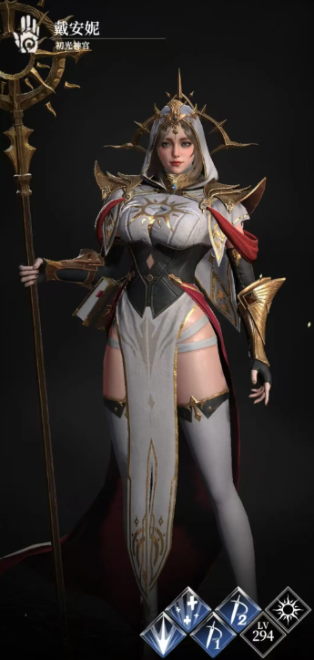 最后为大家推荐的一个角色叫做光奶,这个角色的名字也叫做戴安妮,在游戏当中也是初光神官,她也是属于一个后期类型的英雄,实际上一般这里想要带来更好治疗的话,也就是辅助类的角色一般都是造成后期的效果,这类角色在前期的治疗数值上都起不太来,后期的话用上治疗的机会也比较多,因为前期在面对的敌人效果没有那么强的时候,大家也是没有那么多机会用治疗的,所以在后期用治疗的次数会更多一些,这里的话戴安妮有对于单体boss的克制效果,还有对地下城挑战上面带来的优势,这个角色如果在装备上面是一定要带回能套的,因为她在整体机制上面,魂能套带来的加成是比较符合回复能力的,然后在装备上面带虹羽贝歌是专属的一个装备,一定要带上。