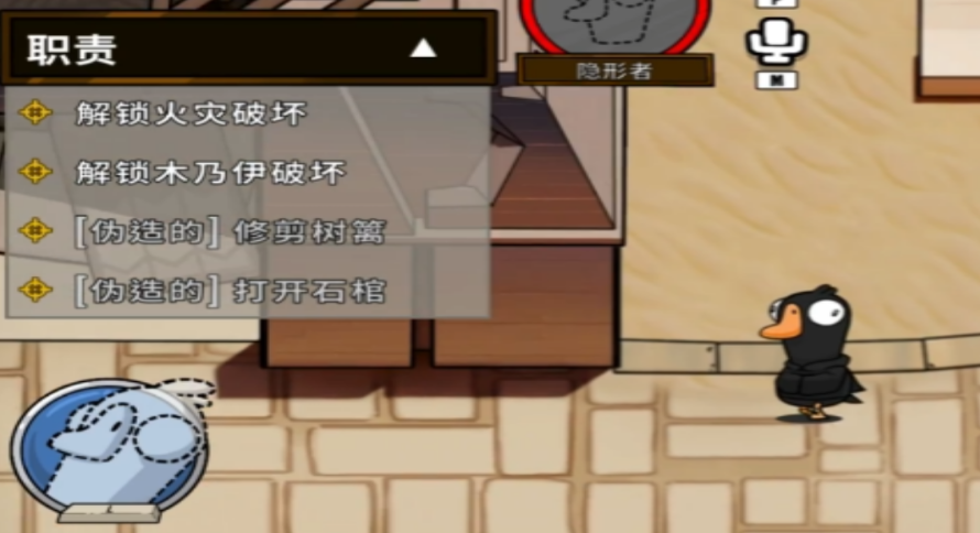 玩家成为隐形鸭的时候,在鹅鸭杀手游当中要了解他的技能,比如他能够持续5秒钟的时间直接隐身。并且在隐身的状态下,它的移动速度也将会大幅度的提升,简单来说就是隐形鸭在隐身快速接近目标或者是逃离危险的时候,这个技能其实能够有效的帮助他。虽然隐身的技能具备一定的优势,但是它其实也具备代价,而他所看到的视线全部都是灰色的,在这样的情况下,他不能够看到队友,也不能够看到敌人。