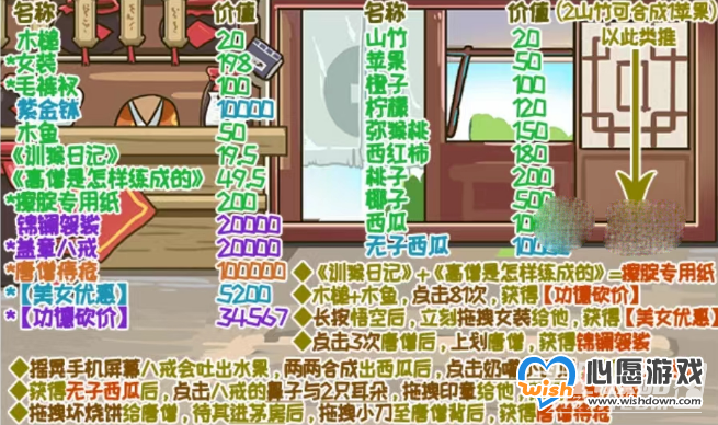 3、点击唐僧,训猴日记+高僧是怎样练成的=擦腚专用纸,价值200;木槌+木鱼,点击81次,获得功德砍价,价值34567