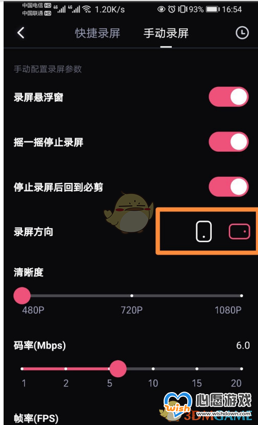 3、进入“手动录屏”之后,可以自行设置录屏方向,系统默认为横屏。