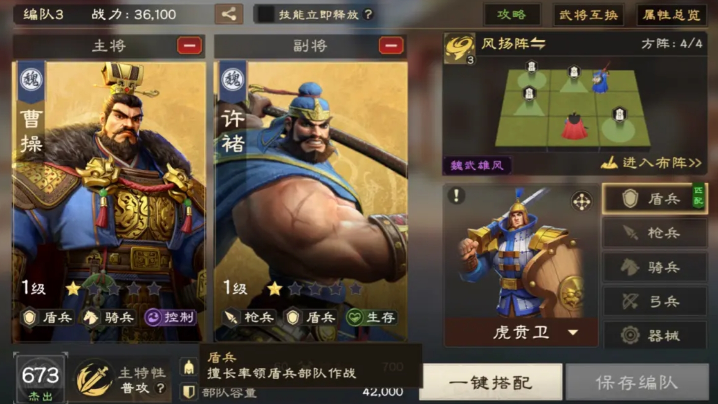 有许褚的协助,能让整队的生存能力得到极大的提升,而玩家们能免费领到的曹操又可在队伍里提供缴械负面,会让敌方无法有效地打出伤害,所以在实战中这套搭配所能打出的效果非常不错。再加上两名武将都有盾兵的特性,所以很适合携带盾兵兵种来进行作战。