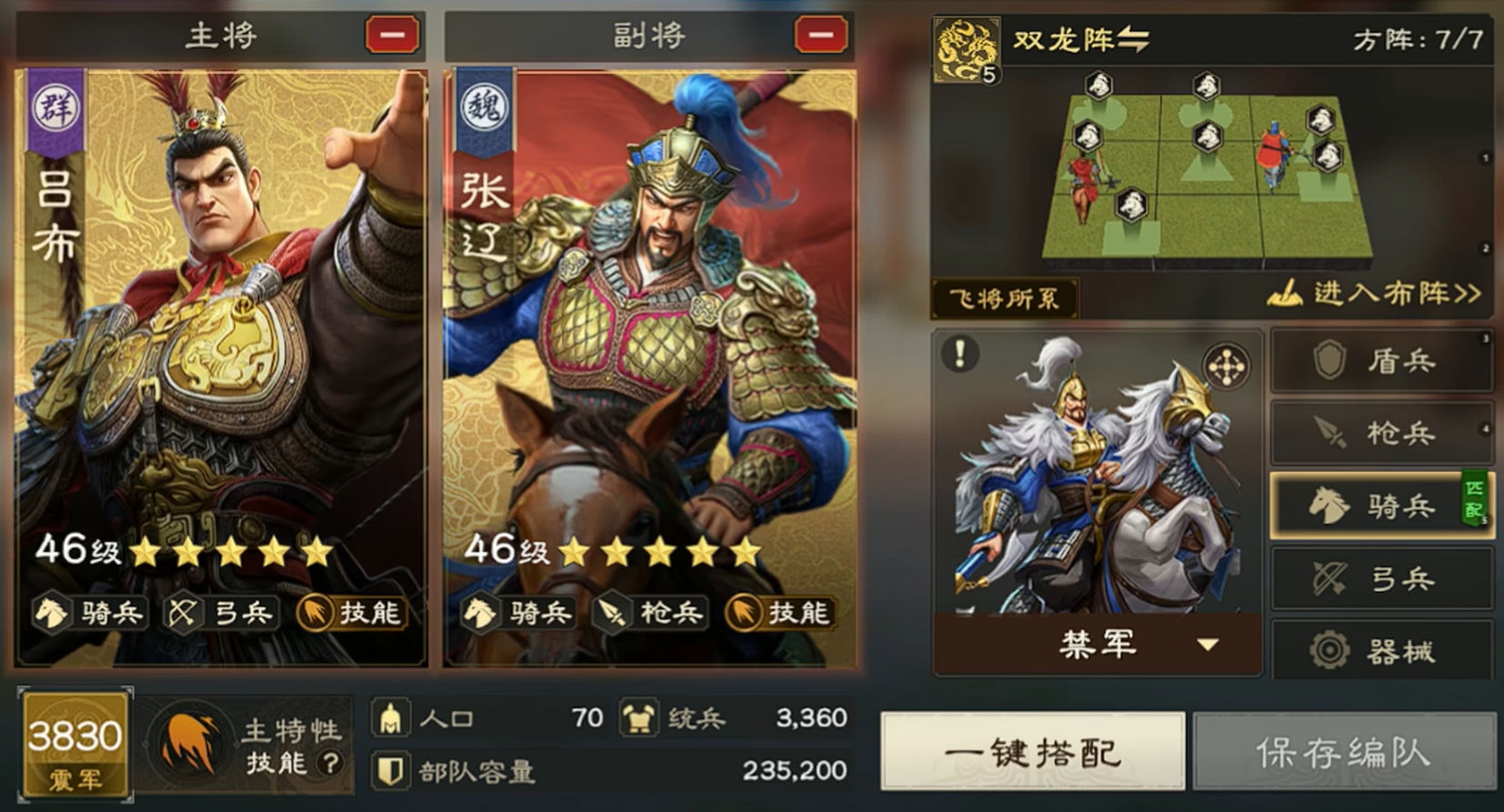 吕布不光自身输出高,连带着也能为所带领的骑兵与弓兵加攻,配合上张辽能让兵种普攻时有概率进入堪破效果的特性,会令整个队伍既有着无比优秀的输出能力,也有着很出色的生存能力。倘若吕布成功觉醒,那么在50%爆伤的加成下,该队伍的输出还能变得更高。