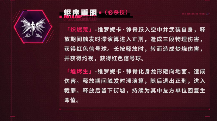 普通攻击也会分成两种不一样的状态,虽然都是物理性伤害,但玩家需要注意,在不同状态下所拿到的信号球是不一样的。裁罪期间只可以使用蓝色球黄色球,而普通攻击只拿蓝色球。正刑在这一个过程中主要是拿红色球,还有黄色球,普通攻击是拿红色球。在切换的时候,信号球也会保留对应的颜色,所以这一点大家千万不要搞混了。烬序重明这就是一个必杀技能,更是大招中的大招,一旦在释放之后就可以武装自己,会造成三段物理性的伤害,并且还会有一个灼视的效果。