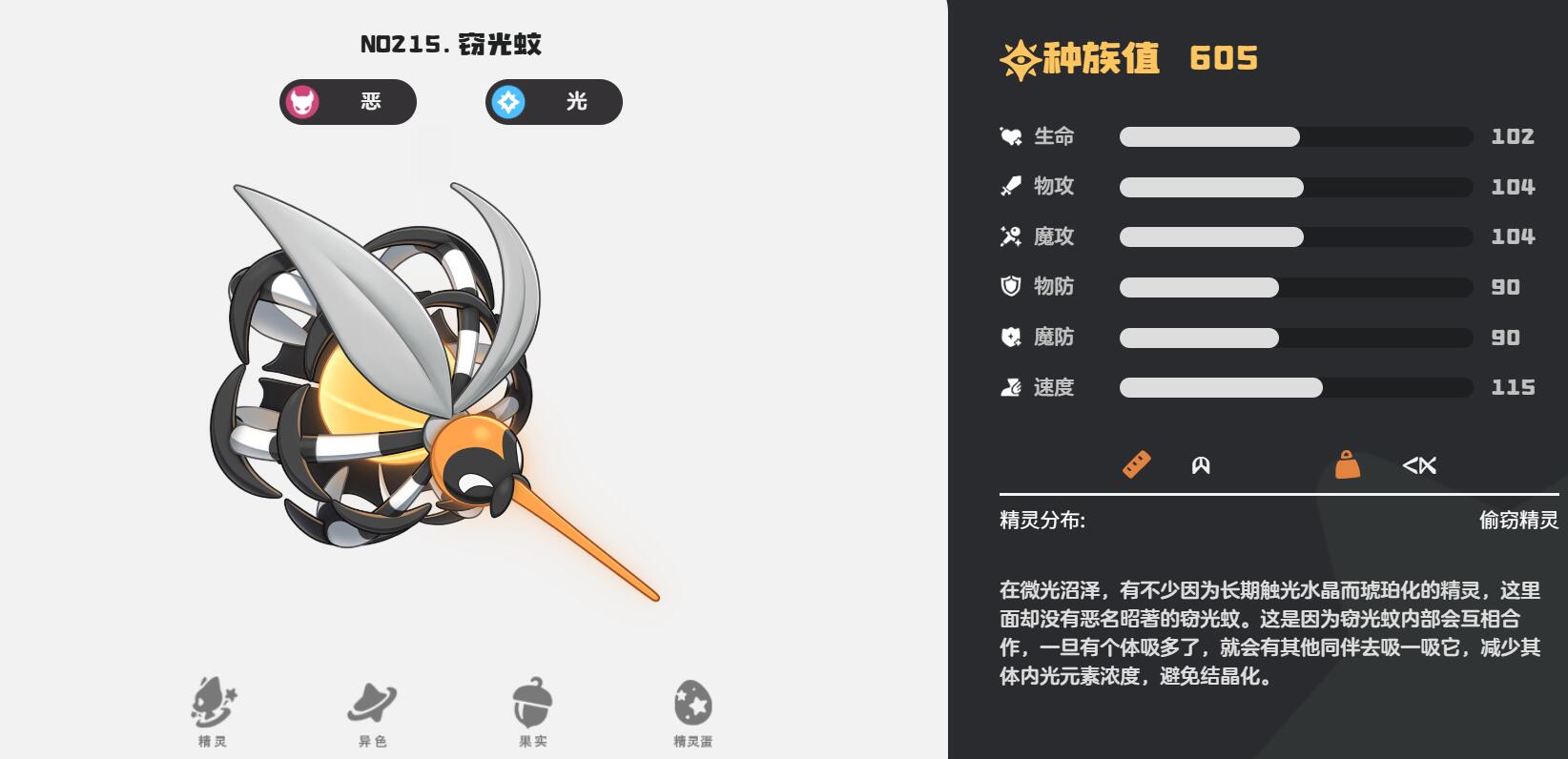 窃光蚊是恶系加光系的双属性精灵,双攻都是104,速度115,能力很均衡。前期就能抓,设定很有反差感,它的物防魔防都是90,生存能力不错,而且它拥有非常不错的吸血combo技能组合,再加上被动(每带一种系别的精灵就能增加10%的技能威力,配合贪婪,获得10%的吸血,能显著增加吸血能力),生存能力极强,是我们刷图资格自足的好精灵,新手强烈推荐。