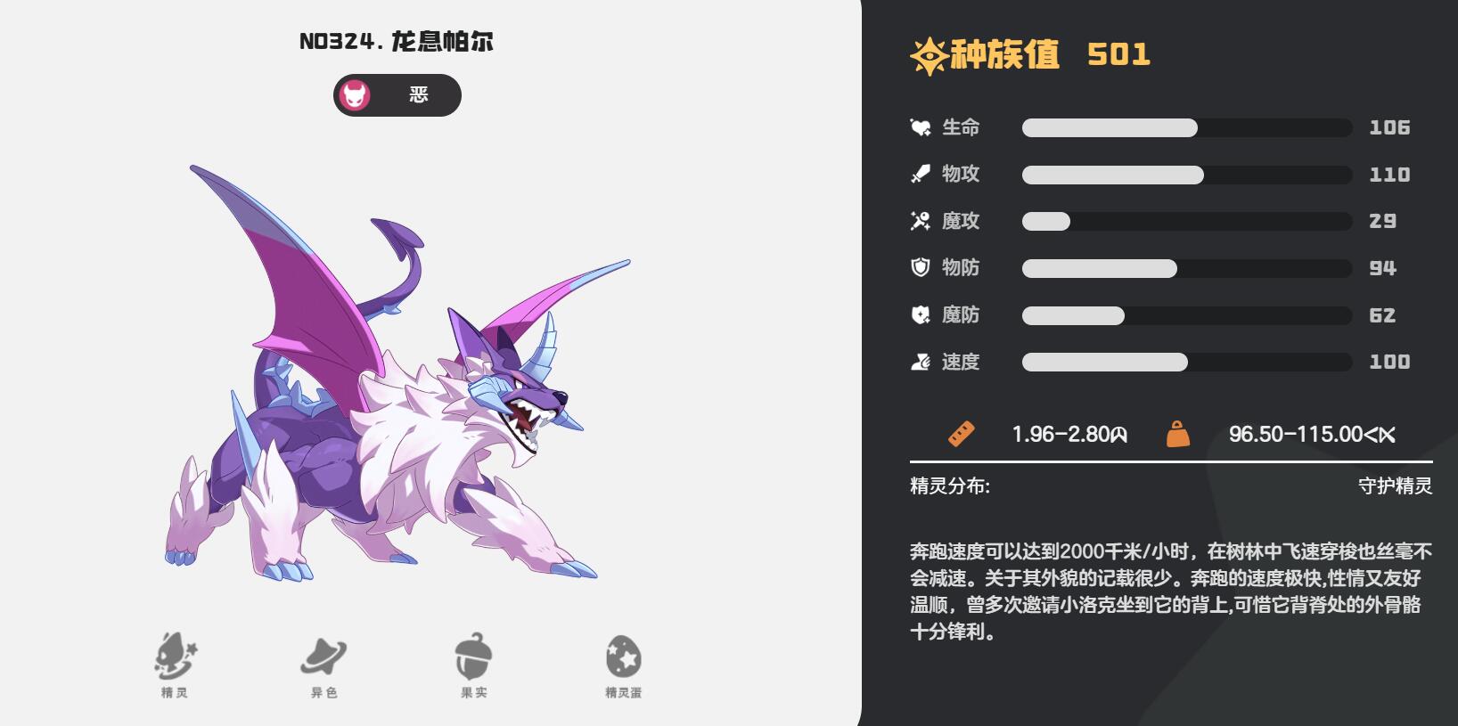 龙息帕尔,全游戏唯一神级宠物,物攻110和速度100让它成为出色的游击手,生命值106也够用。就是魔攻29太低。被动是主动击败时,额外让对方损失1点魔力。技能有强制交换生命比例,吸血,龙炮等等,非常强势。