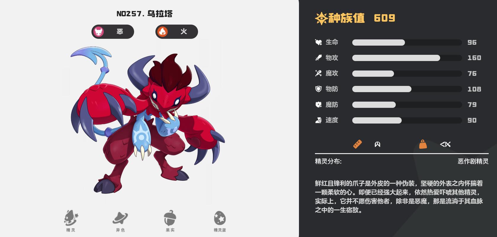乌拉塔是个混伤恶+火双属性的输出精灵,物攻160高得吓人,物防108也很能扛。战斗时用它当主力物攻手,配上增加物攻的技能,秒掉对方不成问题。魔攻76也不浪费,火系技能能够形成纯输出技能搭配,被动是主动攻击就能获得50%的攻击,有C位潜力,主要技能炎息,火系技能造成物理伤害,为它量身打造,加成全部吃到,输出非常可观。