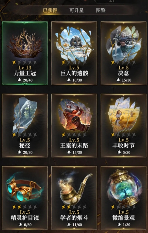 秘宝升级所需的材料可从推图或商店中拿到,产量并不是很大,所以各位最好根据自己阵容的需求,来挑选一些对阵容加成大的秘宝来升级,后续再有多出来的资源时,再考虑去养成其它的秘宝。而在升星时,则需要消耗同名秘宝碎片来完成升星,升至满星后无法再继续向上升,且升星至一定程度阶段后,能解锁秘宝的等级上限,令秘宝能继续提高等级。秘宝加成效果会根据它们自身等级和星级的提高而增加,当秘宝满级和满星时达到最高。