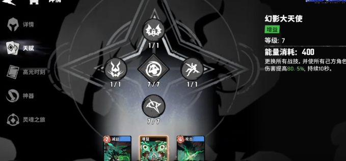 还有天赋技能界面其实分得很清楚,上面全部都是被动技能,下面则是普通攻击技能,重点的是中间的这些小技能,还有大招。小技能就是左上角数字的法力消耗,在放的时候还需要看一下队伍内所有人员的法力条是否足够。大招就会有一些不一样。一个英雄全部都是单独去计算,能量满了之后就可以直接放,而如果想要放得更快一些,那就可以直接搭一个打火机英雄,例如神奇先生。在打架的时候真的还是超级好用的。