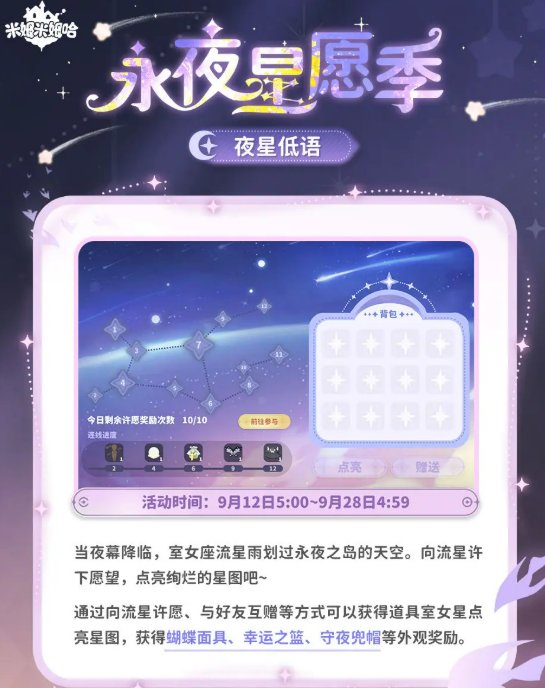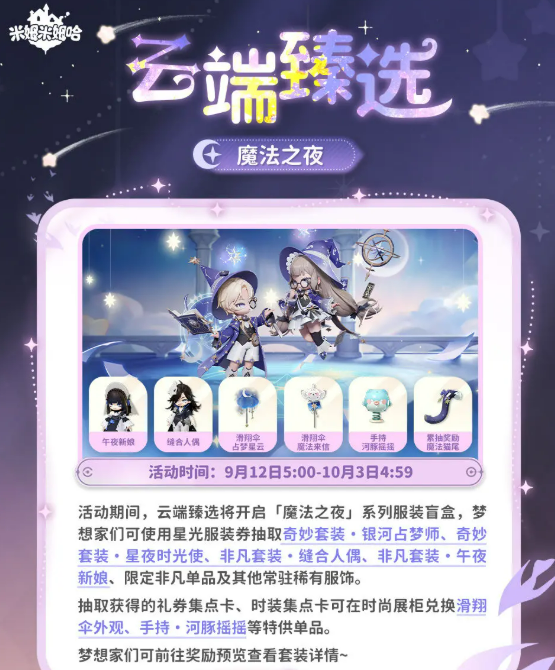 但说到最引人注目的,还是接下来一系列的外观活动!9月12日至10月3日,“魔法之夜”系列服装盲盒将会闪亮登场,里面有着充满奇幻色彩的银河占梦师、星夜时光使、午夜新娘等时尚套装。更重要的是,通过集点你还有机会兑换到专属的手持道具——河豚摇摇,这可是大家争相抢购的单品!此外,“森夜露营”系列活动也将为你的家园装饰带来全新活力,奇妙帐篷、月牙吊床等独特家具,让你的家变得别具一格。