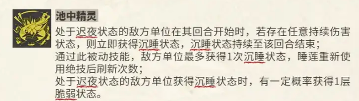 睡莲的被动技能“池中精灵”更是一个战术性的亮点。只要敌人处于迟夜状态且身上有持续伤害,她便能让敌人再次陷入沉睡,同时附加脆弱效果。这样的控制能力,配合她的其他技能,可以为队友争取宝贵的输出时间。