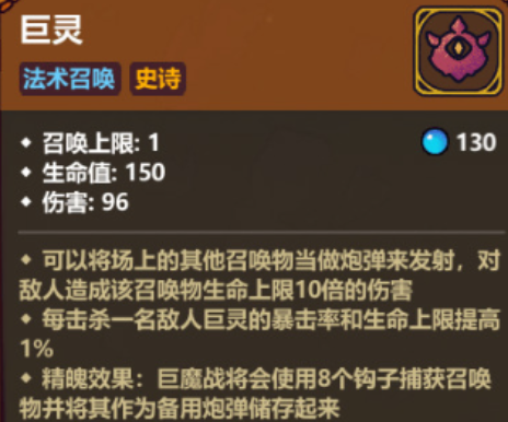 那不得不提的就是巨灵,这就是一个可以迅速成长的召唤物,一开始的生命值是150,但厉害的就是每一次杀掉敌人之后,生命上限和暴击率都会上涨1%。这个攻击的方法还是比较特别的,不仅可以用炮管去砸击,而且还可以召唤其他的召唤物,会造成高额的伤害。