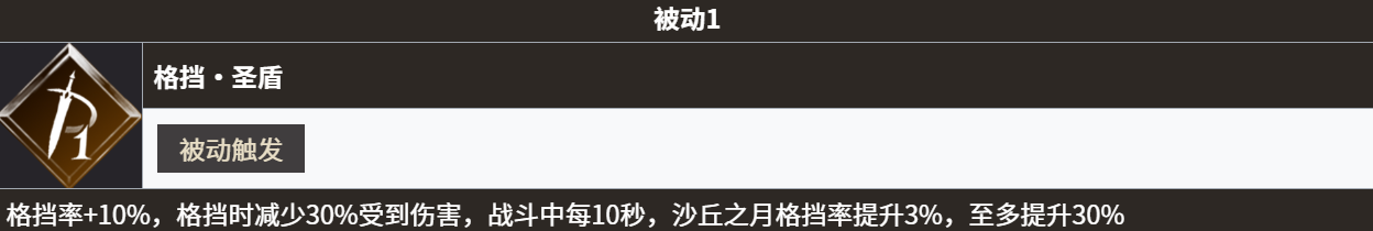 被动技能1格挡·神盾能够使沙丘之月的格挡率增加10%,在格挡时能够降低30%的伤害,战斗时,该被动技能每过10秒钟就会触发一次,触发后格挡率能够增加3%,格挡率也时能够叠加的,最高可以叠加到30%,被动技能2充盈需要玩家在格挡的基础上触发,只要触发了格挡,那她的能量就能自动回复100点。