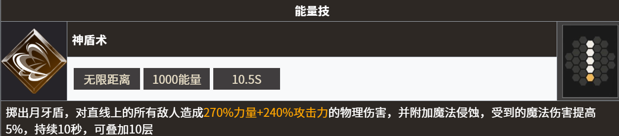 能量技能神盾术爱发动以后,沙丘之月会直接对直线上的敌人投掷出月牙盾,月牙盾能够给敌人造成力量为270%和攻击力为240%的物理伤害,同时还会给对手附带上魔法侵蚀,敌人所受到的魔法伤害会也会提升5%,该效果是能够叠加的,最高可以叠加10层。