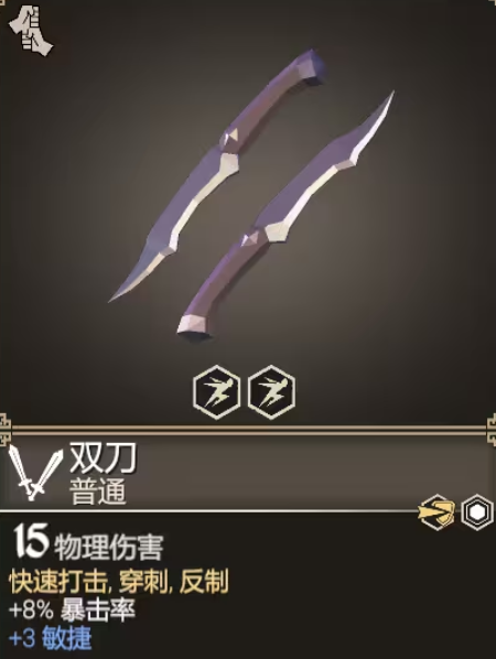 如果是玩双刀这个武器的话,带来的物理伤害会比棍要多一点,因为它带来的物理伤害是15个点,此时的话会有一个快速打击的能力,在攻速上面会有一定的提升,而且输出的时候可以带来穿刺以及反制的压制能力,在暴击率其实上面是有8%的提升,而在敏捷上面只有三点的提升,但是这个敏捷度对于刺客类型的角色来说也是足够的。