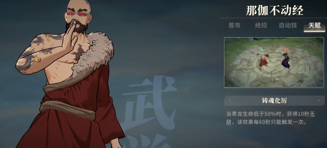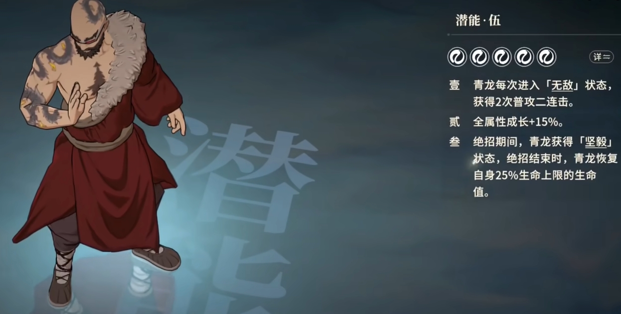 青龙有着血量将至50%以下后就能获得10秒无敌的天赋,并且该状态的优先级相当高,不管敌人用什么样的攻击都没办法对开启无敌后的青龙造成任何的伤害,也没有任何的手段能反制青龙,令他提前结束掉10秒的无敌。此外,青龙的自动技也具备着可让他进入无敌的能力,只要己方角色使用怒气便可为青龙累积充能,一旦充能点数达到了6点,那么青龙就能开启主动技,来获得6秒的无敌。