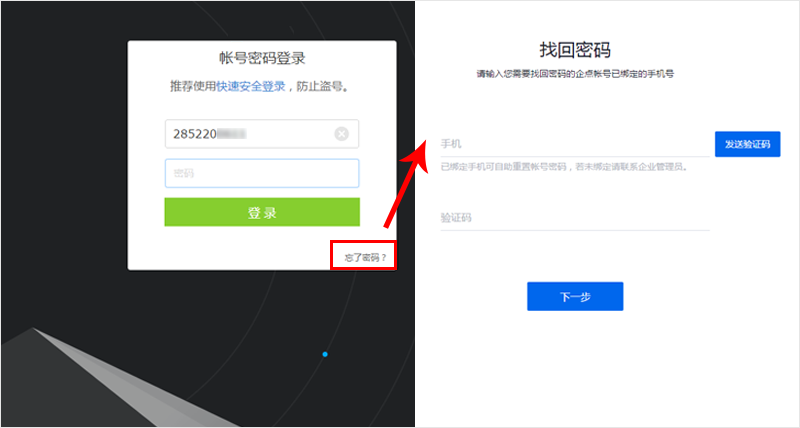 3、任意工号,均可在登录前的企点客户端或账户中心找到找回密码的入口,下图以PC端为例: