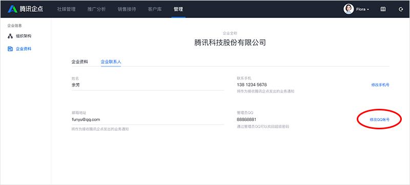 在账户中心【管理】模块-【企业资料】功能-【企业联系人】板块中,点击修改QQ账号即可,如下图所示: