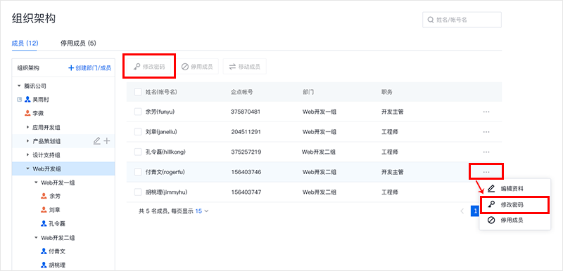 1、企点管理员账号或被赋予了管理权限的工号,均可在账户中心【管理】模块-【组织架构】功能中,对工号进行单个或批量的修改密码的操作,如下图所示: