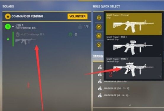 当左边出现1号箭头的界面且你的人物左边伴有绿杠并且出现A的字样则证明你为该小队队长,在右边选择装备,进入地图(推荐选择2号箭头的光瞄步枪)。