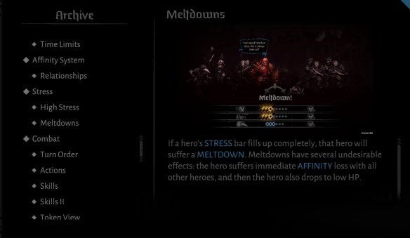 如果一个英雄的压力条满,他将会遭受一次理智熔解,熔解会导致多种不好的效果,熔解英雄的所有当前好感度都会失去,并且会坠到低生命值。