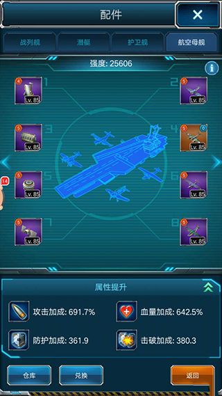 5、更强的战舰都缺不了配件哦,大家千万要记住每天的作战中心补给线,配件会大大的提高你的战斗力,但打补给线是要能量的,主要看你自己怎么运用。