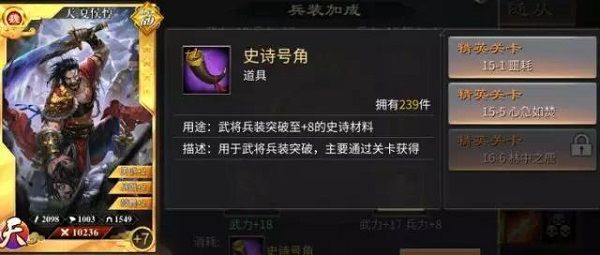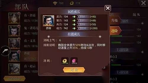 再说卡牌进阶,武将卡每次进阶都会较大幅度的提升人物属性。卡牌进阶需要消耗金币和粉色的血玉以及进阶目标卡牌的同名武将卡(不限品质、层级),所以想将一名武将培养到极限,需要多收集几张同名的卡牌。