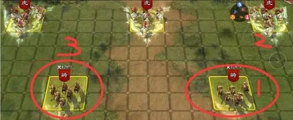 通过图片可以看出,关键点的两个骑兵中是右边的先放技能,中招是不可不免的。而左边的这个技能释放相对靠后,那么我们过关的方法就是集火他,让他技能放不出来。少中一轮DEBUFF,多保存一些血量就是3星通关的关键。