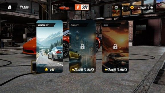 7、不断在地图里完成各种比赛和挑战来获得金币和星星,解锁更多的车辆和地图来体验不一样的竞速乐趣。