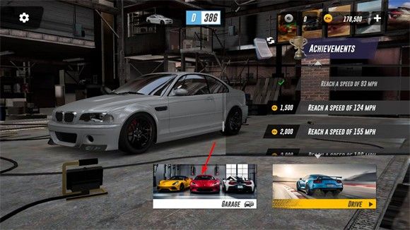 1、进入游戏后在主界面点击下方的garage进入车库。