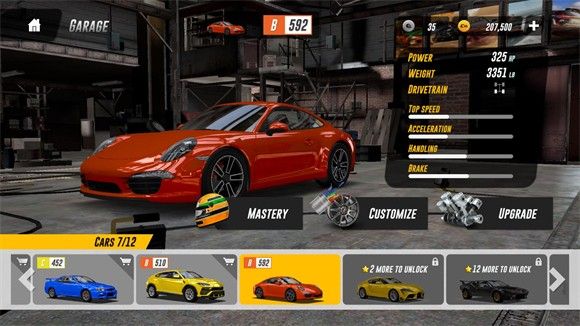3、解锁车辆后点击upgrad可以对车辆升级,点击customize可以更换车辆涂装,点击mastery可以消耗点数升级技能。