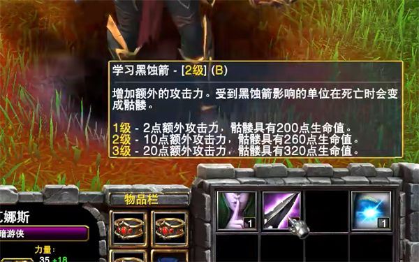 B技能黑蚀箭,增加额外攻击力,受黑蚀箭影响的单位会成为骷髅,最高提升20攻击力,骷髅拥有320点生命值。