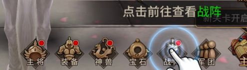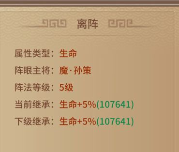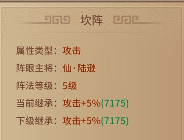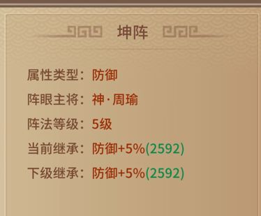 战阵分别四大家族(蜀、魏、吴、群)是由七卦阵环环相扣阴阳结合而成,分别为离阵、坤阵、兑阵、乾阵、坎阵、艮阵、震阵,每个阵眼分为5级,每阵到达相应等级可解锁。
