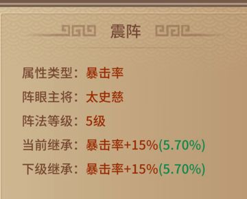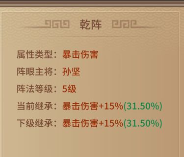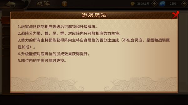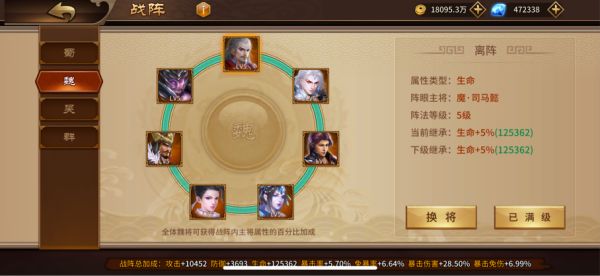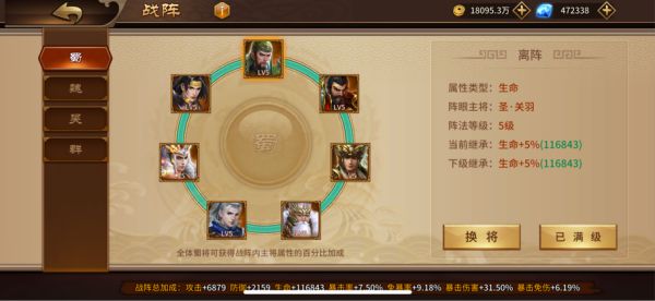 战阵摆放由于每个人的培训过程不一样,摆放位置也不同多试几次调整,一个个试哪里战力高放哪里。武将战力高,加成就高,战力太底,战阵显示不了多少战力,算百分比。