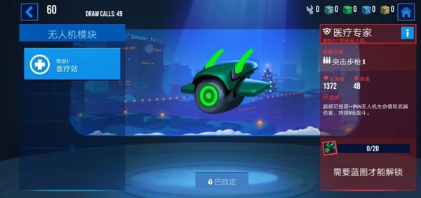 无人机模块激活时,无人机就地停止,切换为医疗站模式,无人机周围一定半径范围内的所有队友均能得到治疗,恢复一定的生命值,无人机等级越高,治疗持续的时间、范围、生命值就越高。